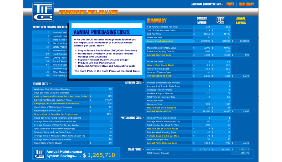 Tifco Industries needed an interactive sales tool to show the cost benefit of going with their business model of procuring products from their catalogs and how much money their clients would save over the course of a year. I turned to flash to create a project that could be used on a web site, but also be used on the sales team laptop's and opened and reviewed in person with the prospect and current clients. This project was a modern and slick looking UI/UX from the old html based tool, which would not work if the sale's team did not have internet access. It could have been created in other formats, but flash was a scalable, and interactive medium that allowed me to make a slick interface and professional animations.