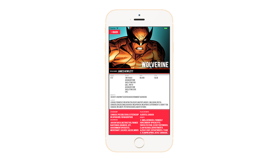 A successful iOS App Store submission that is now available to download. The original design was implemented, with very few design compromises. In fact I added more design UI elements than originally considered, once the opportunity to parse the Marvel Wiki pages presented itself.